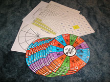 The Music Wheel game c2005-2007 is designed to teach Key & chord identification in a fun & memorable way. Based on the circle of fifths, the game teaches basic I, IV, V triad chord progressions and their minor relatives that form the basis for composition in a particular Key. Description : Played much like “Bingo,” the caller calls out, for instance, “Key of A, the I chord”; players look at The Music Wheel to identify the letters representing the “I” chord and then cover those letters on the game card. Eventually, a player(s) who has covered all the letters vertically or horizontally shouts “Music Wheel” and wins that round. More than one way to approach the game: The game can be played by keyboard students, (one student to a card); or, it can be teamwork--played by three instrumentalists to a card. The first objective is to cover the appropriate letters on the game card with pennies or bean markers. The second objective is to voice the harmonic tones of the triad chord that is called. (Or, the game can be played without instrumental voicing--one student per card) How to be a winner! The winner(s) of each round then writes the triad chord last called into the appropriate section of the circle score grid. Each time a student(s) wins, the caller chooses a bonus music trivia question to ask the winner. If the student(s) answers correctly, he/she/they can fill in an additional chord. If the student(s) answers incorrectly, the instructor (caller) can choose to assign a 10-second nursery rhyme song-and-dance to the student(s). Students can store the circle score grids in their music notebooks. Each time the game is played, the student(s) will be adding more chords.