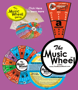 The Music Wheel is a detailed circle of fifths showing Key families of chords — the majors and their related minors (musically referred to as chord progressions).
